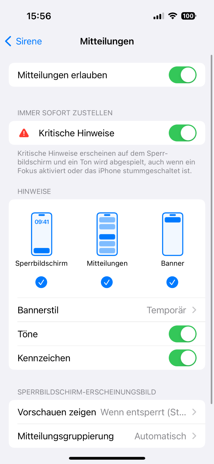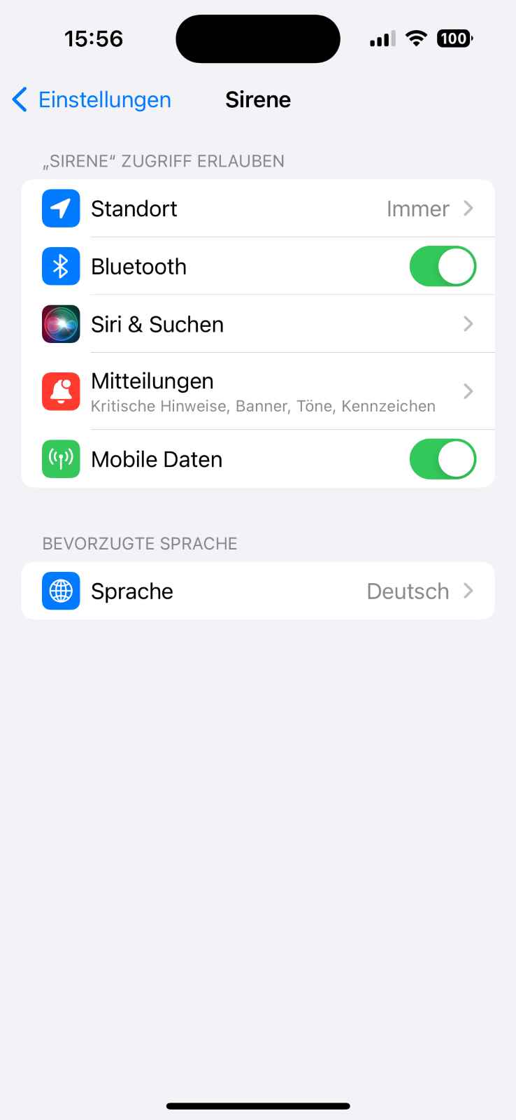 Um sicherzustellen, dass du nie einen Alarm verpasst, wenn ein Kontakt Hilfe benötigt, aktiviere immer die Benachrichtigungen für die App und erlaube den Zugriff auf deinen Standort entweder immer oder zumindest während der Nutzung der App. Wenn du die zweite Option wählst, wirst du während einer Alarmierung aufgefordert, deinen Standort zu teilen, und musst dies manuell aktivieren. Es ist einfacher, von Anfang an "immer" einzustellen.